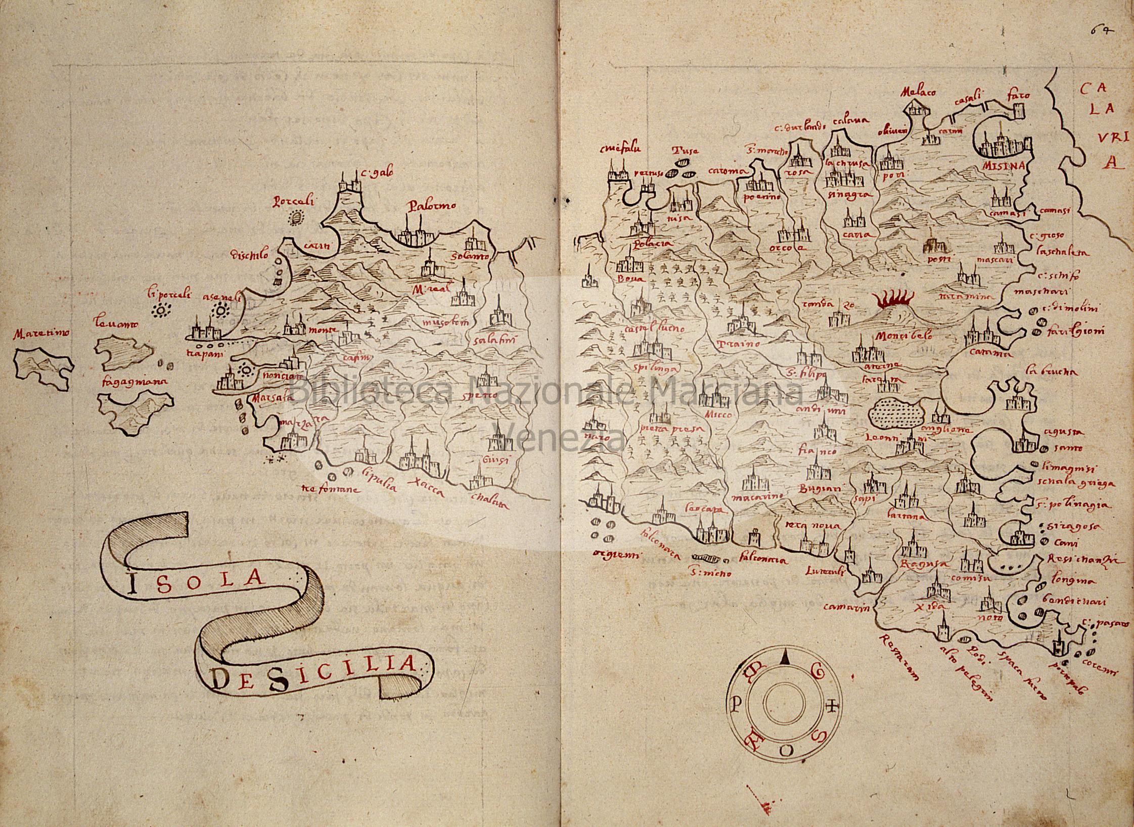 Descrizione : *Arte del navicar de Antonio Millo armiralgio dal Zante... Con l'isulario di tute le isole dil mondo... l'isulario dil mar meditaraneo... Fecit Ano 1590 zenaro Mat.cartogr.manoscr.] | Antonio Millo. - S. l. [Venezia?] , 1590. - 1 atlante (114 f. : c. geog.) ; 303 x 207 mm . - Frontespizio: "Arte del Navicar De Antonio Millo Armiralgio Dal Zante Nel nel qual si contiene tute quele chose qual richiede a uno perfetto navichante si di la praticha come di la siencia con tute le sue dicerie et tavole per trovar tuto quelo che nel ditto libro si contiene. Con l'isulario di tute le isole dil mondo principiando dal Cholfo mesichano et tute le isole di la nova spagna overo india ocidiental li costumi et dicerie di le isole et tute quele di l'india orientale con le sue deschricione l'isulario dil mar meditaraneo principiando dala isola di gieviza prima del dito mare dala pate di ponente fino ala isola di Cipro ultima di dito mare mediteraneo tute disegnate con longeza largeza con quanti miglia circhondano con citade porti scholgi nomi con sui bosoli per veder le isule come stano et aqua da bever donde si trovano et li fondi de li porti quanti pasa con le distancie di tute le isole del mar Egeo" Codice legato in pelle con impressioni in oro sui piatti. Il codice conta il frontespizio + 113 ff. numerati a penna. L'Isolario vero e prorpio ha inizio al f. 52