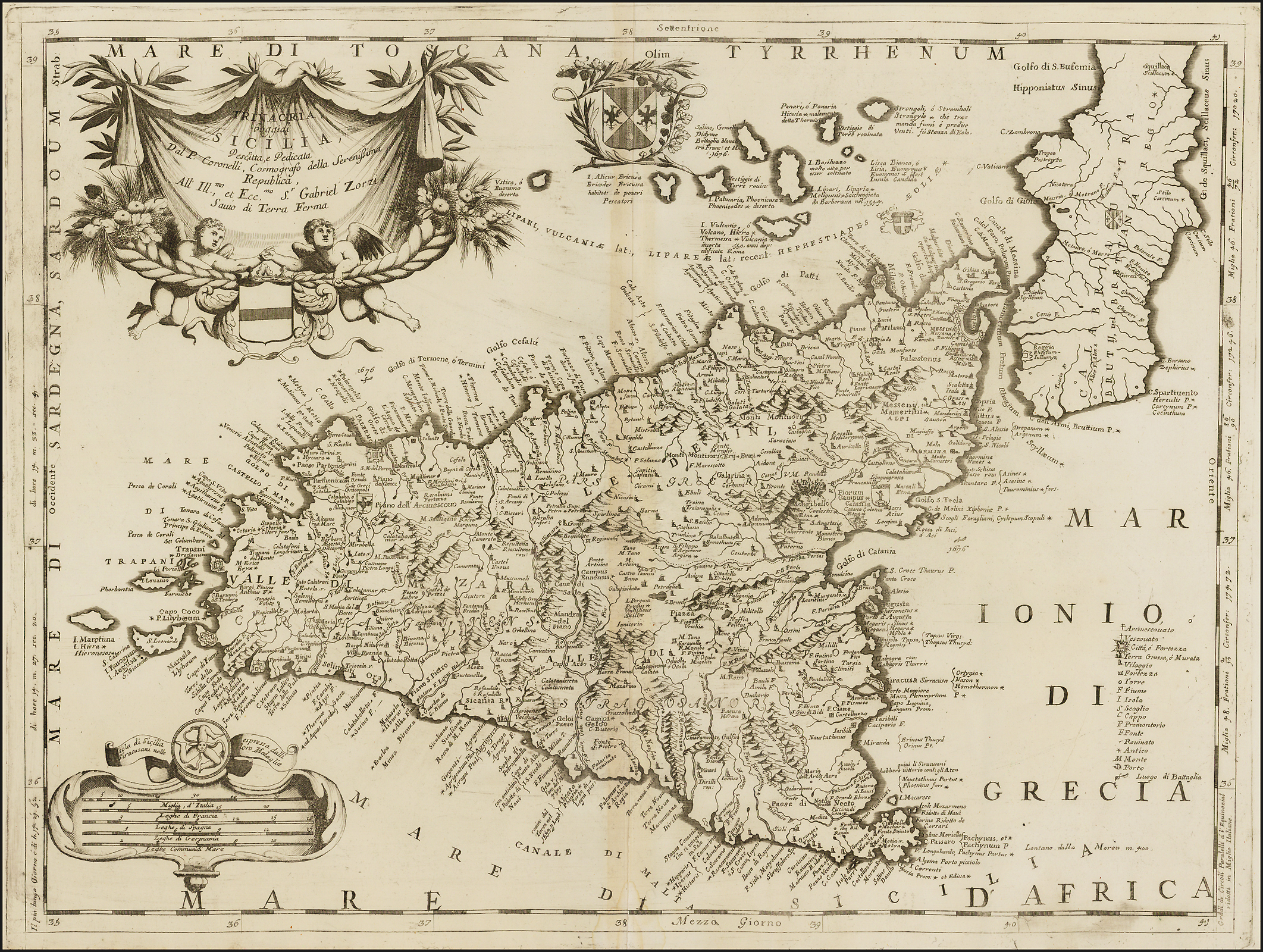 Description: Finely engraved map of Sicily, which appeared in Volume 1 of Coronelli's Corso Geographico, published in Venice.
