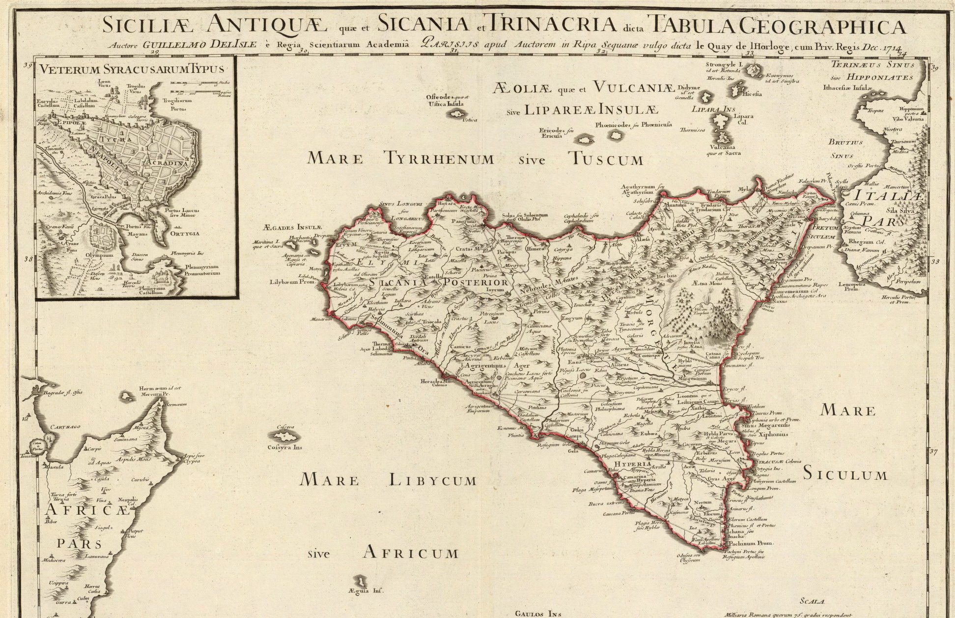 Note : Engraved map in outline color. Shows forests, etc. Covers also Malta and Lipari Islands. Relief shown pictorially. Inset map: Veterum Syracusarum typus.