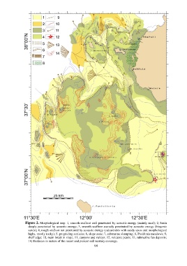Figure 2. Morphological map. 1, smooth seafloor well penetrated by acoustic energy (mainly mud); 2, basin