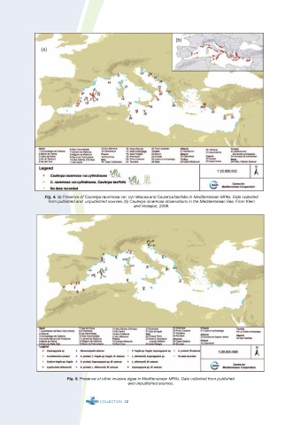 Fig. 4. (a) Presence of Caulerpa racemosa var. cylindracea and Caulerpa taxifolia in Mediterranean MPAs. Data collected