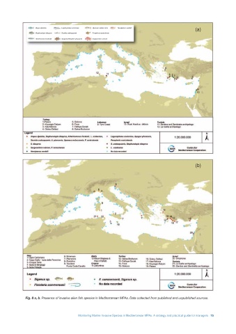 Fig. 8 a, b. Presence of invasive alien fish species in Mediterranean MPAs. Data collected from published and unpublished sources.