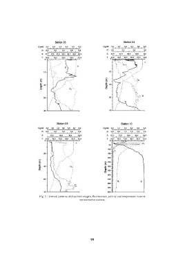 Fig. 2 - Vertical patterns of dissolved oxygen, fluorescence, salinity and temperature in some representative stations. 99