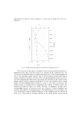 Fig. 4 - Vertical pattern of copepod diversity (Hƍ) and abundance (ind m-3).