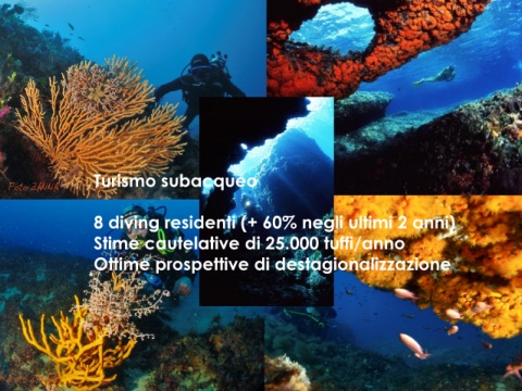 Turismo subacqueo 8 diving residenti (+ 60% negli ultimi 2 anni) Stime cautelative di 25.000 tuffi/anno Ottime prospettive di destagionalizzazione