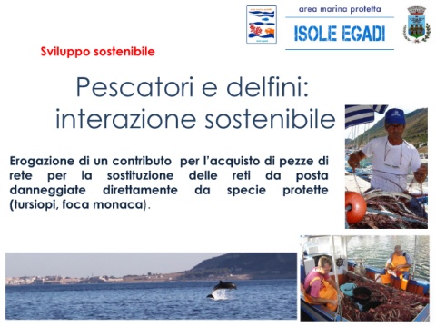 Sviluppo sostenibile Pescatori e delfini: interazione sostenibile Erogazione di un contributo per l’acquisto di pezze di rete per la sostituzione delle reti da posta danneggiate direttamente da specie protette (tursiopi, foca monaca).