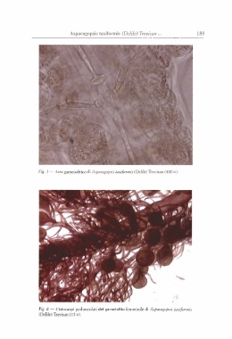 Asparagopsis taxiformis (Drlile) Trevisnn ... - l89 Fig. 5- Asse garnetofitico di Aspurugopsis ~uxi/orilzis(Delile) Trevisan (400x). 'ig. 6 - Cistocarpi pedun,,.,ii del garnetofito feniniinile di Aspor(igop.ris tusi/r~rmr~ Delile) Trevisan (15 x).