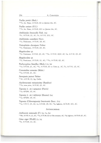 ''"'Ma, 10.VII. 74, 1/1, AC; **Le, 8.VI.80, 0/2 su Olea europaea, AC; ''Sa; laghetto; 18.VI.89, 0/1, A C.