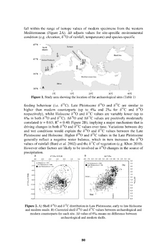 Figure 2. A) Shell δ O and δ C distribution in Late Pleistocene, early to late Holocene