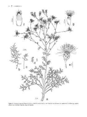 52 G. DOMINA ET AL. Figure 4. Centaurea aegusae Domina et al.: a, habit; b, rosette leaf; c, stem leaf; d, branch leaves; e, capitulum; f, phyllary; g, cypsela (drawn by G. Domina from the original material).
