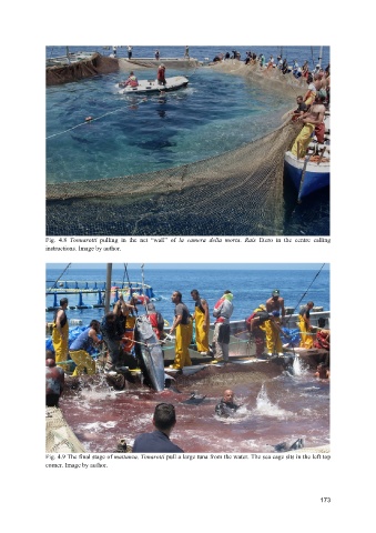 Fig. 4.9 The final stage of mattanza. Tonarotti pull a large tuna from the water. The sea cage sits in the left top