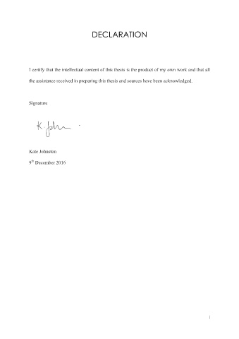 DECLARATION I certify that the intellectual content of this thesis is the product of my own work and that all the assistance received in preparing this thesis and sources have been acknowledged. Signature Kate Johnston th 9 December 2016 i