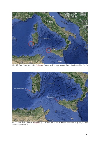Fig. 1.2 San Pietro (top left), Favignana (bottom right). Map adapted from Google Satellite (2016). Fig. 1.3 San Pietro (top left), Favignana (bottom right) in relation to Sardinia and Sicily. Map adapted from Google Satellite (2016). 46