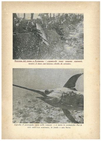 Mattanza del tonno a Favignana: giganteschi tonni vengono arpionati, mentre il mare tutt'intorno ribolle di schiuma. Tal volta il {Jescespada entra nelle tonnare e vi m ette lo scompiglio. Poi fi· nirà anch'esso arpionato, in fondo a una barca.