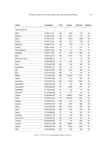 Worldwide checklist of the island mutillid wasps (Hymenoptera Mutillidae) 537 Table 1/3. Islands’ list with geographical data (continued).