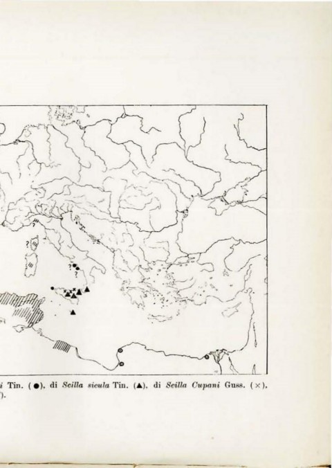 Fig.  Ili  - Distribuzione  geografica  di  Scllll•  Hughii  Tin.  ( e ).  di  Scilla  sic"la  Tin.  (A ),  di  Scillf1  C1t7J(I11i  GuRS.  ( x ),