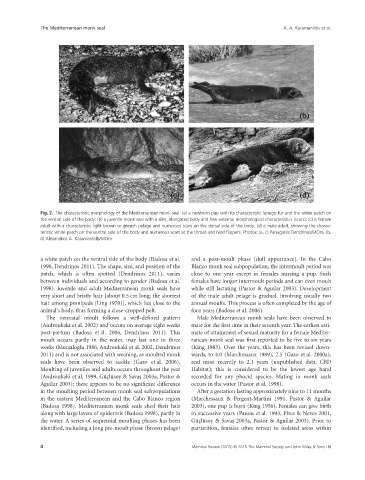 teristic white patch on the ventral side of the body and numerous scars at the throat and hind flippers. Photos: (a, c) Panagiotis Dendrinos/MOm, (b,