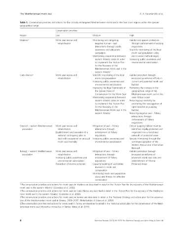 Table 1. Conservation priorities and actions for the critically endangered Mediterranean monk seal in the four main regions within the species’