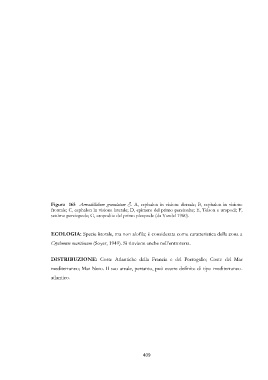 frontale; C, cephalon in visione laterale; D, epimero del primo pereionite; E, Telson e uropodi; F,