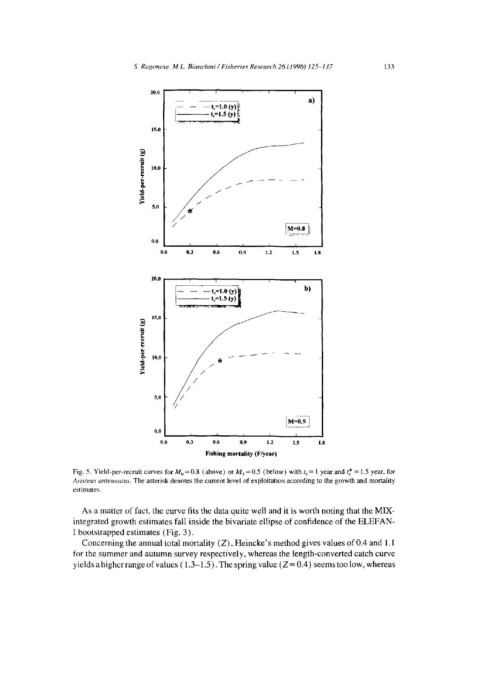 Fig. 5. Yield-per-recruit curves for M"= 0.8 ( above) or M,= 0.5 (below) with fc = l year and t~= L5 year, for