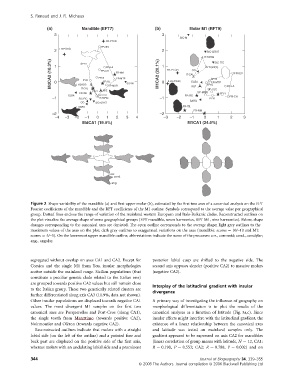 Figure 2 Shape variability of the mandible (a) and first upper molar (b), estimated by the first two axes of a canonical analysis on the EFT