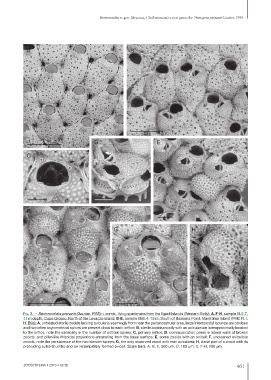 zooids, and pillar-like rhizoidal projections emanating from the basal surface; E, some zooids with an ovicell; F, uncleaned ovicellate
