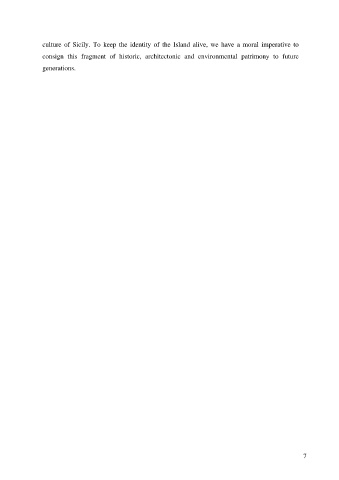 culture of Sicily. To keep the identity of the Island alive, we have a moral imperative to consign this fragment of historic, architectonic and environmental patrimony to future generations. 7