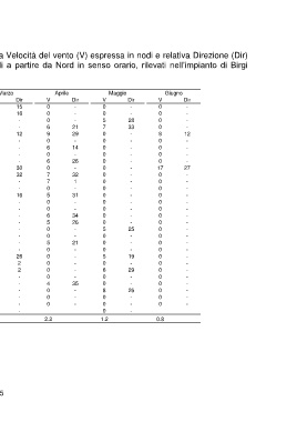 a Velocità del vento (V) espressa in nodi e relativa Direzione (Dir)