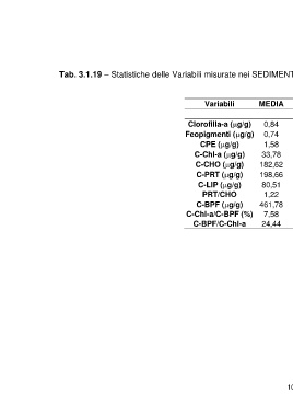 Tab. 3.1.19 – Statistiche delle Variabili misurate nei SEDIMENT