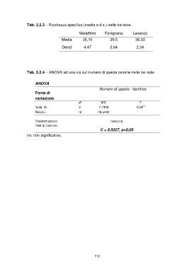 Tab. 3.2.3 – Ricchezza specifica (media e d.s.) nelle tre isole.
