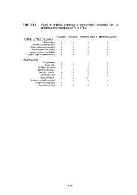 Tab. 3.4.1 – Fonti di materia organica e consumatori analizzati per la