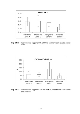 Fig. 3.1.36 - Valori medi del rapporto PRT/CHO nei sedimenti delle quattro aree di