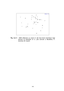 F F MM F Stress: 0,13 M M F F FF M F F F MF F FM FM MF M M MF M F F M F F M M Fig. 3.4.11 – MDS effettuata sui volumi % dei food items identificati negli stomaci di esemplari di C. julis catturati a Marettimo. F: femmine; M: maschi. 196