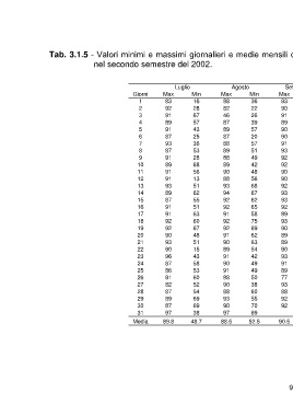 Tab. 3.1.5 - Valori minimi e massimi giornalieri e medie mensili d