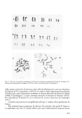 Fig. 2 - Tborecte.r i11termediu.r, popolazione di Ustica. a: cariotipo convenzionale Giemsa; b: cariotipo C; c: