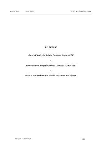 Codice Sito ITA010027 NATURA 2000 Data Form 3.2. SPECIE di cui all'Articolo 4 della Direttiva 79/409/CEE e elencate nell'Allegato II della Direttiva 92/43/CEE e relativa valutazione del sito in relazione alle stesse Stampato il : 20/10/2008 4/19