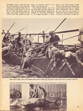 Nets drawn tight, men with hooked poles haul in slithering sea giants worth many lira to cannery operator.