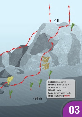 -16 m Tipologia: secca, parete Profondità min-max: 16-36 m Corrente: media / bassa Difficoltà: media Profilo di immersione: quadra Pregio naturalistico: -36 m 03