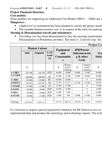 Project Financial Structure Cost models: Manpower : · · · Human Labour cost € 593 500 1-CIRT 2-UTBM 400 000 3 -ISSI 756 000 323 381 4-NOTT 135 000 5-MARI 140 000 6-SASS 7-SEA 60 000 50 000 8-TCPE 2 457 881 TOTAL